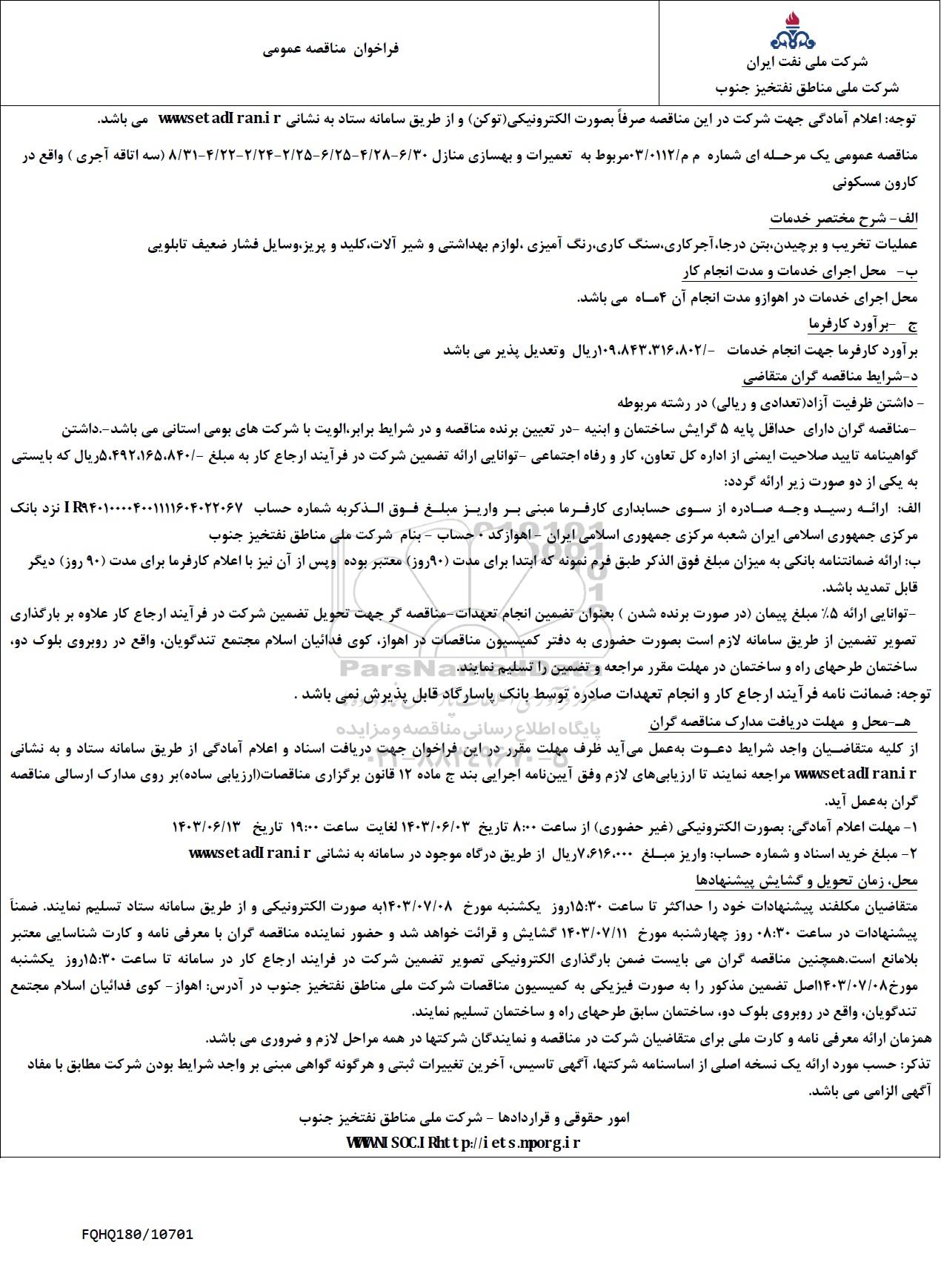 مناقصه عمومی یک مرحله ای شماره م م . 0112.03 مربوط به تعمیرات و بهسازی منازل 6.30 -4.28-6.25 -2.25 -2.24 -4.22- 8.31 (سه اتاقه آجری ) واقع در کارون مسکونی