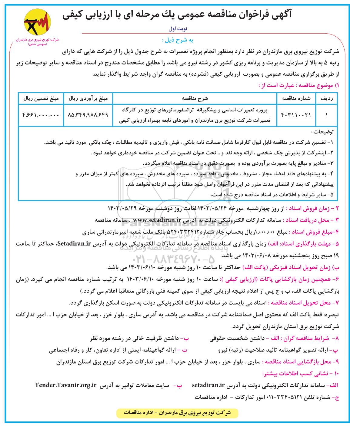 شرکت توزیع نیروی برق مازندران در نظر دارد بمنظور انجام پروژه تعمیرات به شرح جدول ذیل را از شرکتهایی که دارای رتبه 5 به بالا از سازمان مدیریت و برنامه ریزی کشور در رشته نیرو می باشد را مطابق مشخصات مندرج در اسناد مناقصه و سایر توضیحات زیر از طریق برگزاری مناقصه عمومی و بصورت ارزیابی کیفی فشرده به مناقصه گران واجد شرایط واگذار نماید.