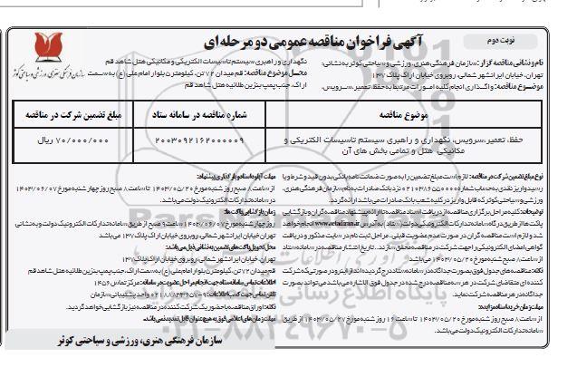 مناقصه حفظ ، تعمیر ، سرویس ،نگهداری و راهبری سیستم تاسیسات الکتریکی / نوبت دوم از کلیه افراد متخصص و شرکتها واجد شرایط دعوت به عمل میآید در مناقصه با کد خبرگزاری پارس نماد: 7858628 شرکت نمایند.