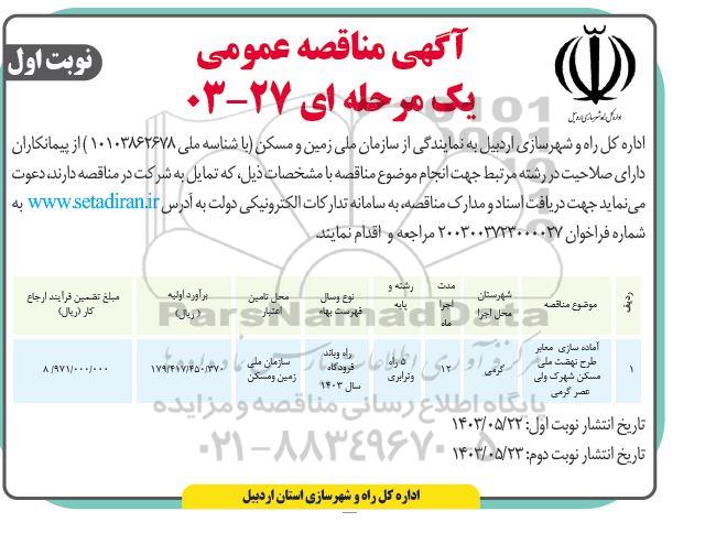 اداره کل راه و شهرسازی اردبیل به نمایندگی از سازمان ملی زمین و مسکن با شناسه ملی 10103862678 از پیمانکاران دارای صلاحیت در رشته مرتبط جهت انجام موضوع مناقصه با مشخصات ذیل که تمایل به شرکت در مناقصه دارند دعوت مینماید جهت دریافت اسناد و مدارک مناقصه به سامانه تدارکات الکترونیکی دولت به آدرس سایت ستاد ایران به شماره فراخوان 2003003723000027 مراجعه و اقدام نمایند.