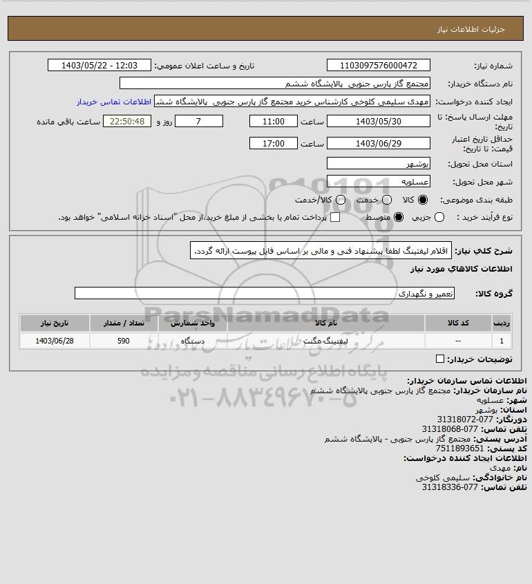 نام دستگاه خریدار:مجتمع گاز پارس جنوبی پالایشگاه ششم