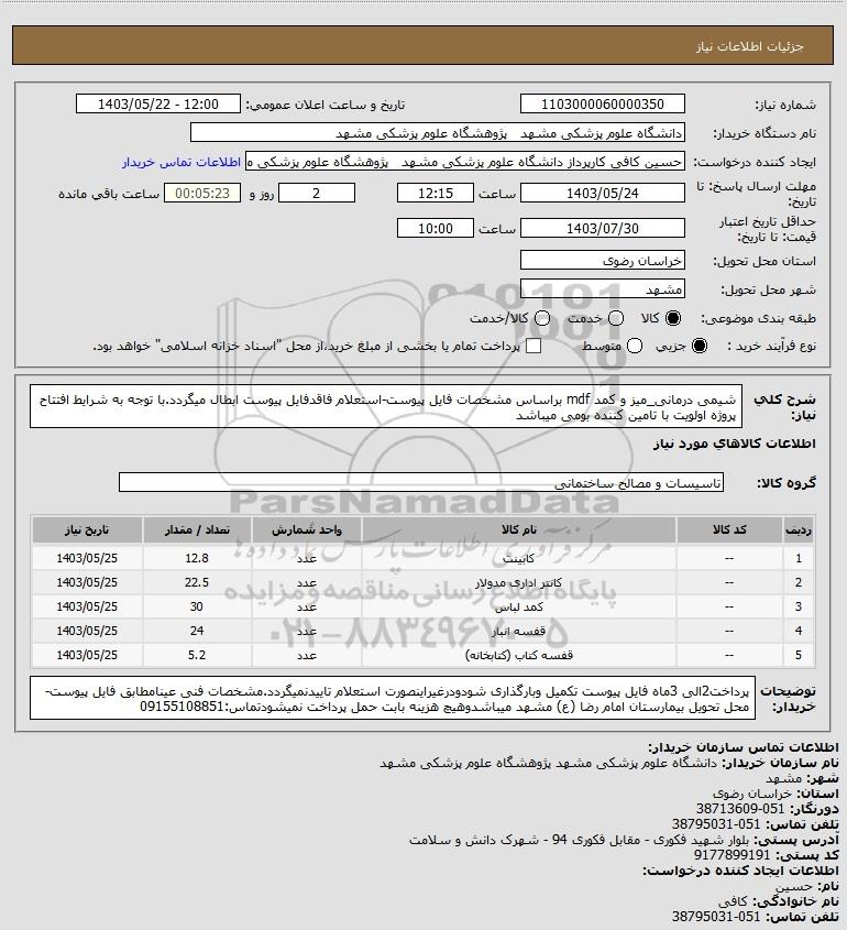 شرح کلی نیاز: شیمی درمانی_میز و کمد mdf براساس مشخصات فایل پیوست-استعلام فاقدفایل پیوست ابطال میگردد.با توجه به شرایط افتتاح پروژه اولویت با تامین کننده بومی میباشد