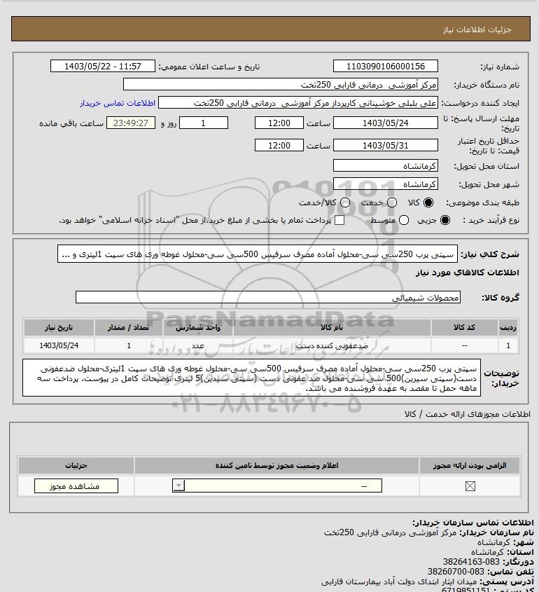 | 1 | -- | ضدعفونی کننده دست | عدد | 1 | 1403/05/24 |