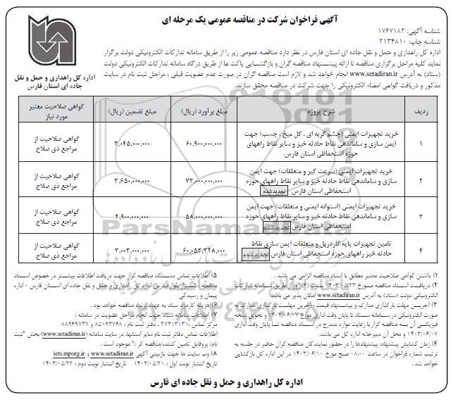 | 1 | خرید تجهیزات ایمنی (چشم گربه ای، گل میخ، چسب) جهت ایمن سازی و ساماندهی نقاط حادثه خیز و سایر نقاط راه های حوزه استحفاظی استان فارس | 60.900.000.000 | 3.045.000.000 | گواهی صلاحیت از مراجع ذی صلاح |