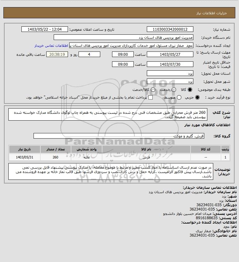 شرح کلی نیاز: 260 متر فرش محرابی طبق مشخصات فنی درج شده در لیست پیوستی به همراه چاپ لوگوی دانشگاه مدارک خواسته شده پیوستی باید ضمیمه گردد.