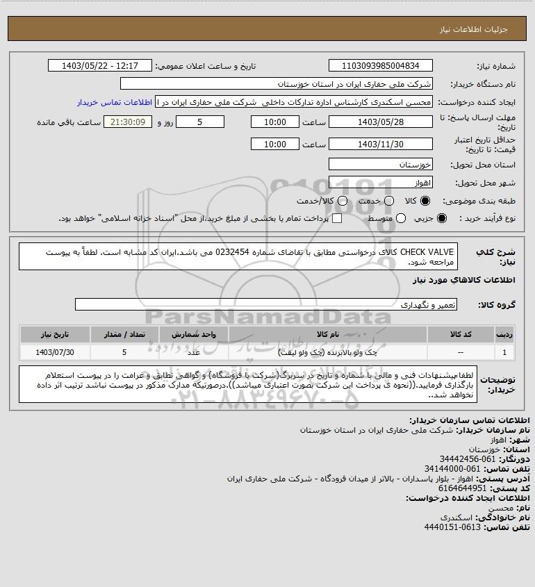 | 1 | -- | چک ولو بالابرنده (چک ولو لیفت) | عدد | 5 | 1403/07/30 |