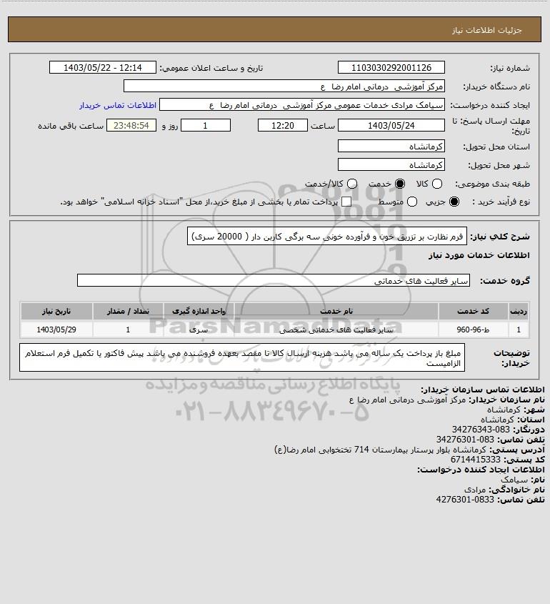 شرح کلی نیاز: فرم نظارت بر تزریق خون و فرآورده خونی سه برگی کاربن دار ( 20000 سری)