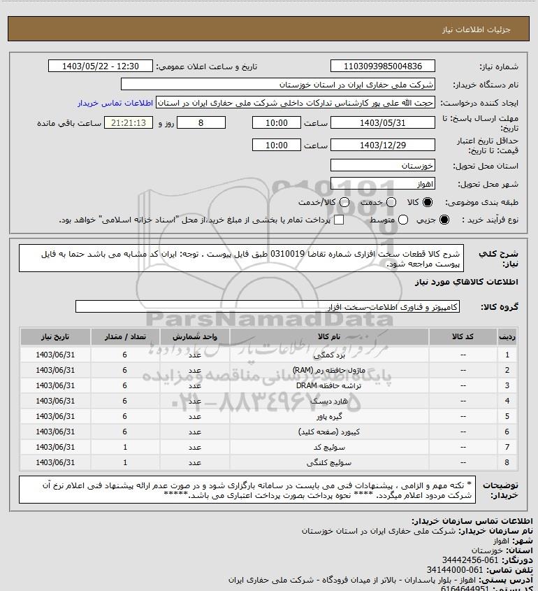 استعلام شرح کالا قطعات سخت افزاری شماره تقاضا 0310019 طبق فایل پیوست . توجه: ایران کد مشابه می باشد حتما به فایل پیوست مراجعه شود., استعلام شرح کالا قطعات سخت افزاری شماره تقاضا 0310019 طبق فایل پیوست . توجه: ایران کد مشابه می باشد حتما به فایل پیوست مراجعه شود.