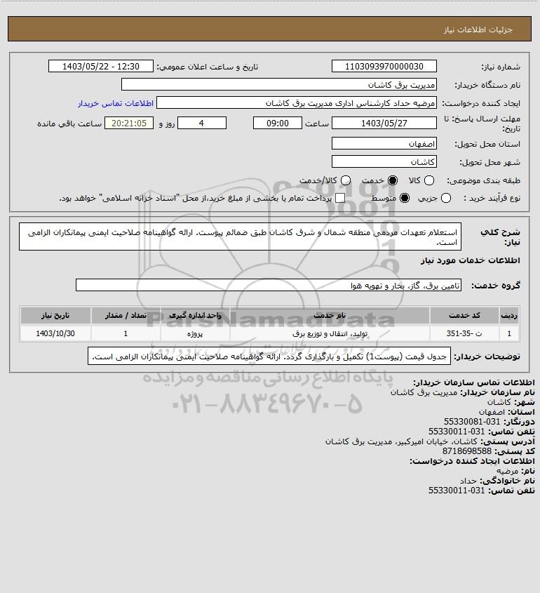 شرح کلی نیاز: استعلام تعهدات مردمی منطقه شمال و شرق کاشان طبق ضمائم پیوست. ارائه گواهینامه صلاحیت ایمنی پیمانکاران الزامی است.
