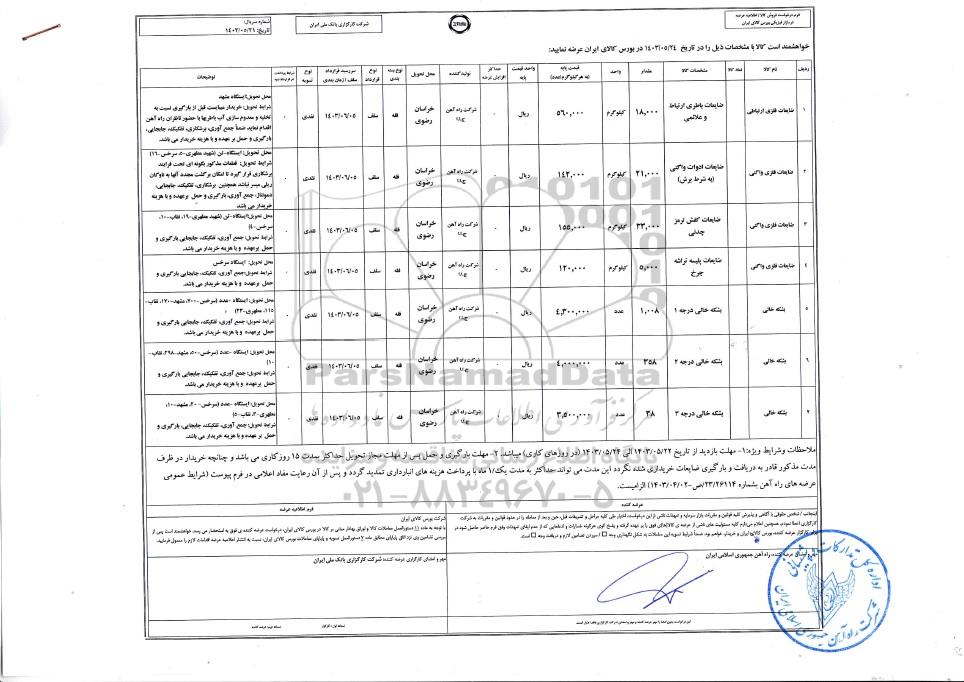| ضایعات فلزی واگنی | 23.000 | کیلوگرم | 155.000 |