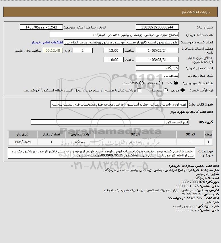 شرح کلی نیاز: تهیه لوازم واجرت تعمیرات اورهال آسانسور اورژانس مجتمع طبق مشخصات فنی لیست پیوست