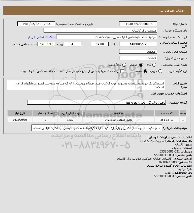 شرح کلی نیاز: استعلام تک تیری روستاهای محدوده غرب کاشان طبق ضمائم پیوست. ارائه گواهینامه صلاحیت ایمنی پیمانکاران الزامی است.
