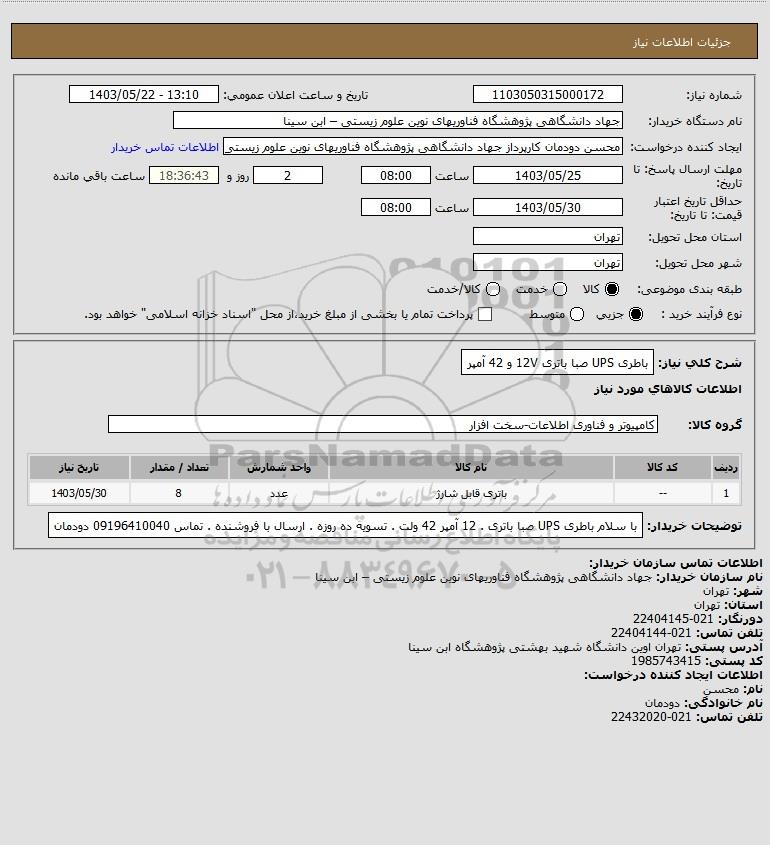 شرح کلی نیاز: باطری UPS صبا باتری 12V و 42 آمپر