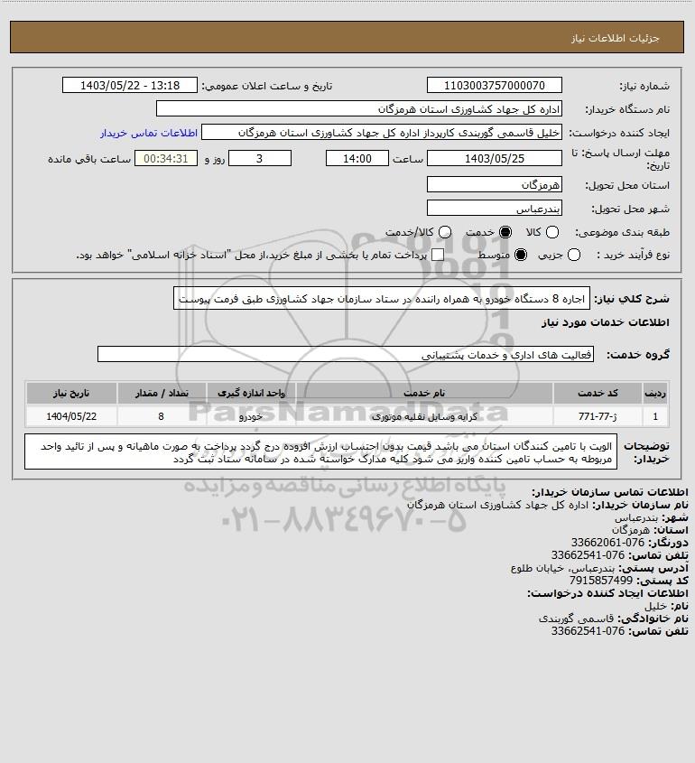 شرح کلی نیاز: اجاره 8 دستگاه خودرو به همراه راننده در ستاد سازمان جهاد کشاورزی طبق فرمت پیوست