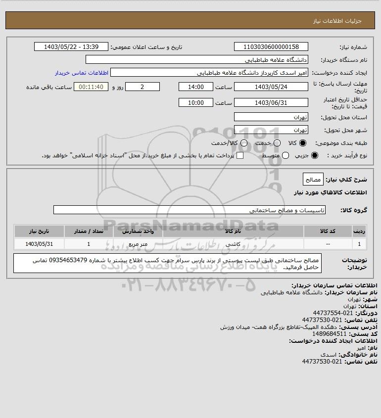 استعلام بها و موضوع استعلام استعلام مصالح به اطلاع کلیه شرکتها و افراد متخصص واجد شرایط میرساند، آگهی گذار در نظر دارد از طریق استعلام بها، نسبت به انتخاب و دریافت پیشنهادات اقدام نماید. این استعلام با کد آگهی ثبت شده در سامانه خبرگزاری پارس نماد : 7859074 منتشر شده است. مشخصات استعلام : تاریخ شروع استعلام: 1403/05/22 آخرین مهلت ارسال پیشنهاد قیمت : 1403/05/24 و محل اجرای پروژه : استان تهران میباشد. استعلام قیمت مورد درخواست : استعلام مصالح با دستهبندیهای تخصصی و گروه های مرتبط : مصالح ساختمانی, کاشی و سرامیک, استعلام اطلاع رسانی میگردد.