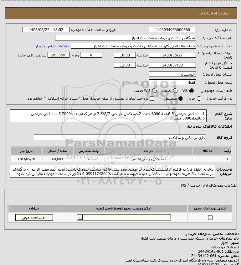 شرح کلی نیاز: 1.دستکش جراحی 6.5تعداد6000 جفت