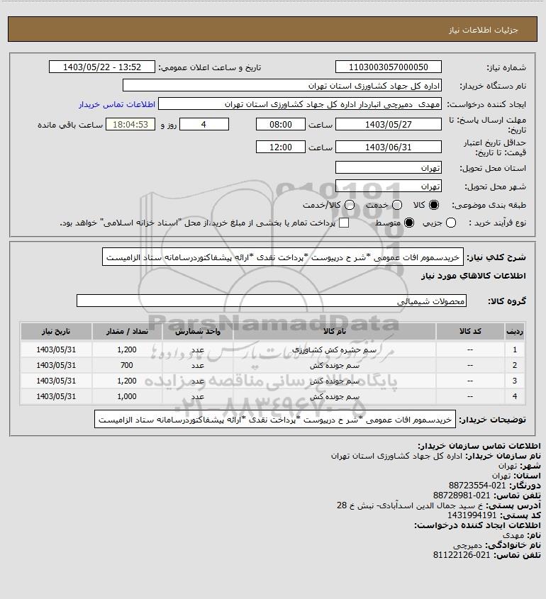 شرح کلی نیاز: خریدسموم افات عمومی *شر ح درپیوست *پرداخت نقدی *ارائه پیشفاکتوردرسامانه ستاد الزامیست