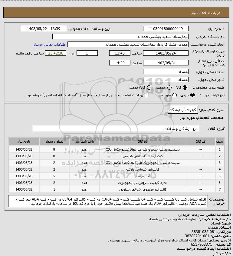 شرح کلی نیاز: کیتهای آزمایشگاه