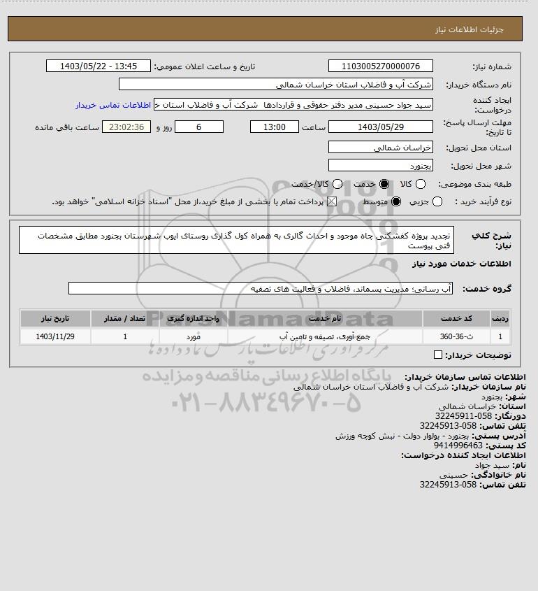 شرح کلی نیاز: تجدید پروژه کفشکنی چاه موجود و احداث گالری به همراه کول گذاری روستای ایوب شهرستان بجنورد مطابق مشخصات فنی پیوست