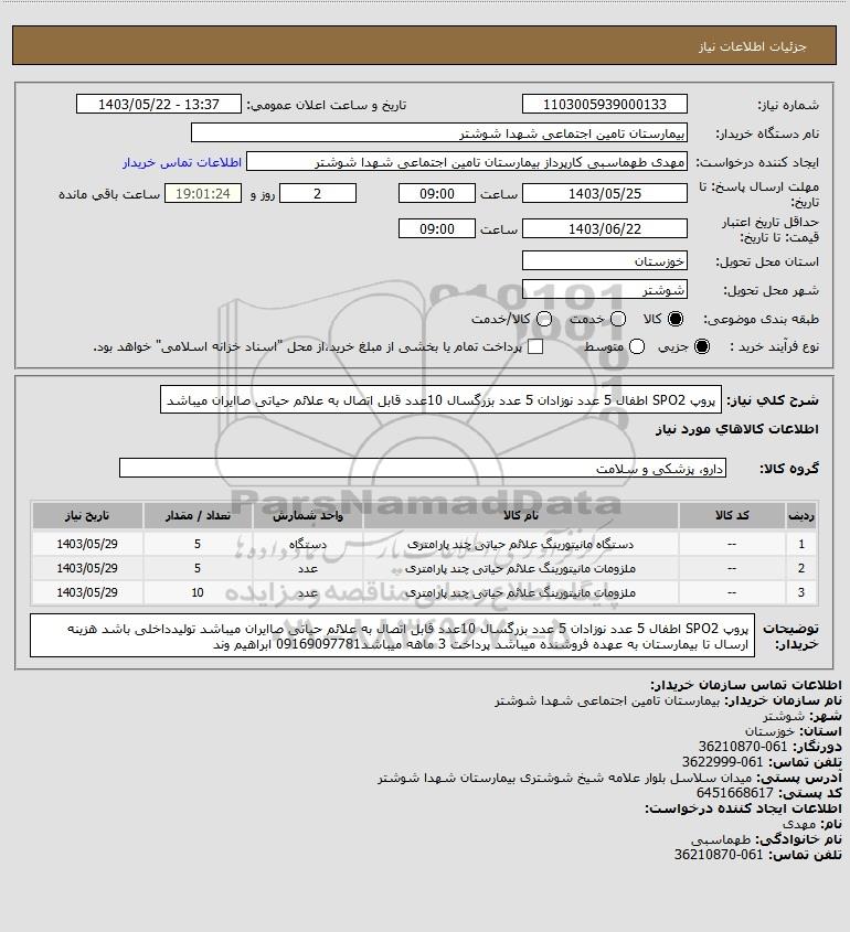 شرح کلی نیاز: پروپ SPO2 اطفال 5 عدد نوزادان 5 عدد بزرگسال 10عدد قابل اتصال به علائم حیاتی صاایران میباشد
