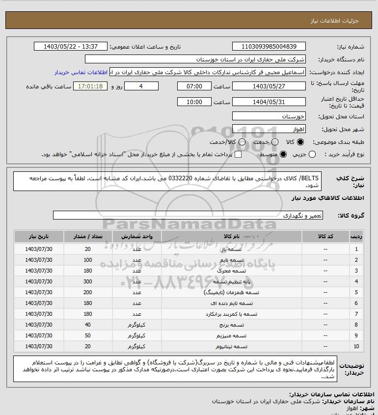 | 2 | -- | تسمه تایم | عدد | 100 | 1403/07/30 |