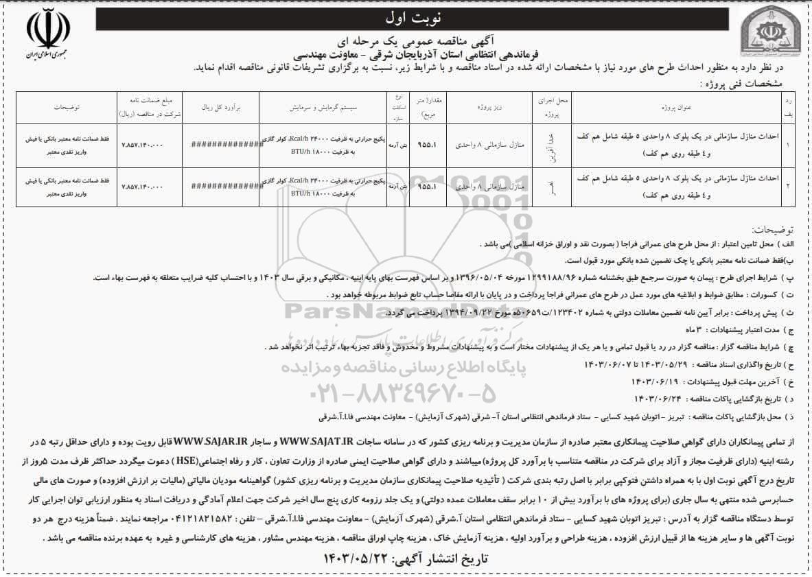 | 1 | احداث منازل سازمانی در یک بلوک 8 واحدی 5 طبقه شامل هم کف و 4 طبقه روی هم کف | خداآفرین | منازل سازمانی 8 واحدی | 955.1 | بتن آرمه | پکیج حرارتی به ظرفیت 24000 Kcalh کولر گازی به ظرفیت 18000 btuh | 7.857.140.000 | فقط ضمانت نامه بانکی یا فیش واریز نقدی معتبر | |