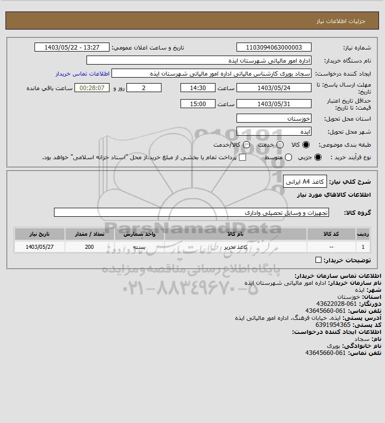نام دستگاه خریدار:اداره امور مالیاتی شهرستان ایذه