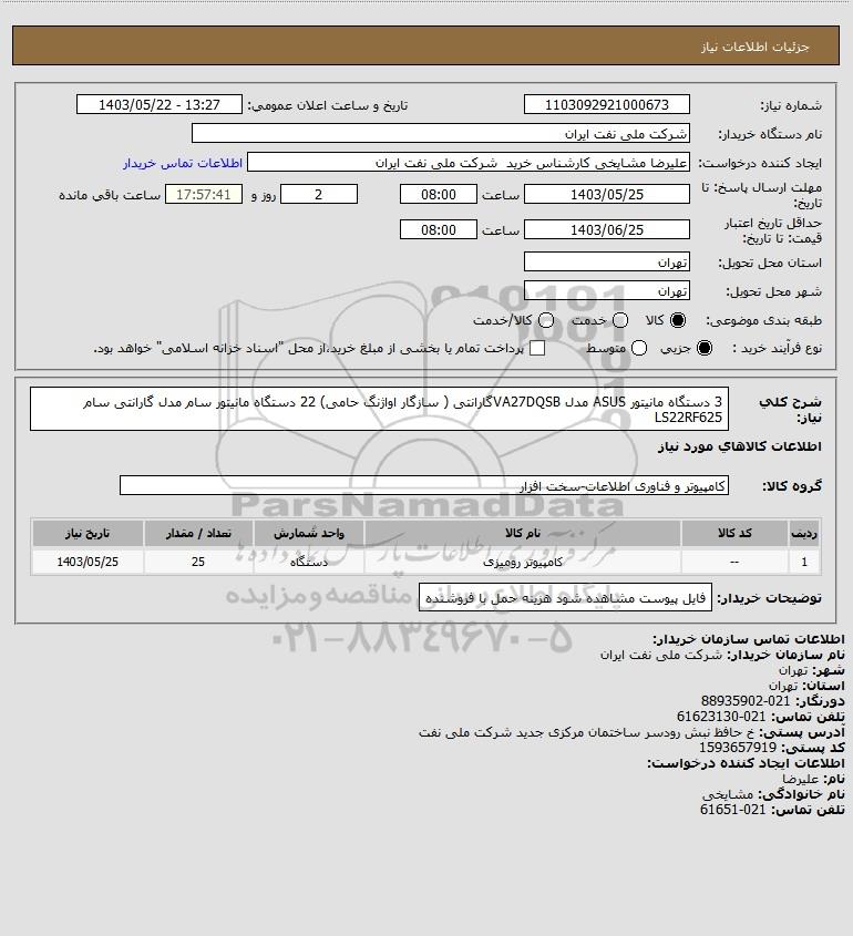 شرح کلی نیاز: 3 دستگاه مانیتور ASUS مدل VA27DQSBگارانتی ( سازگار اواژنگ حامی)
