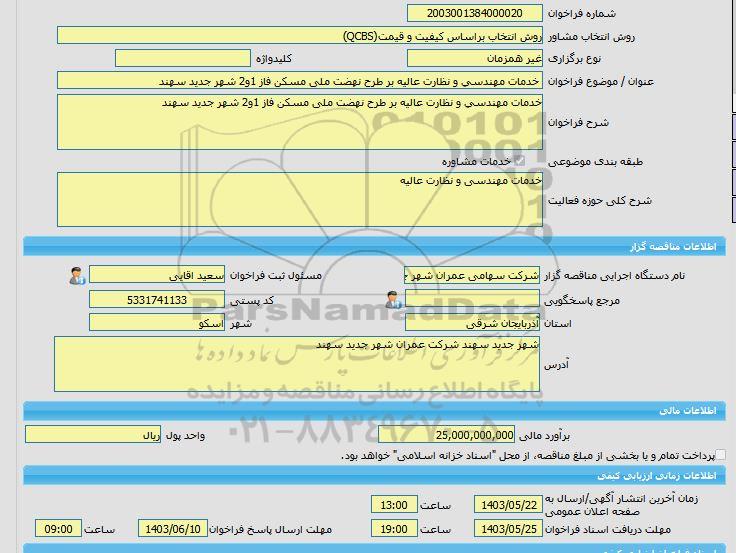 نام دستگاه اجرایی مناقصه گزار شرکت سهامی عمران شهر جدید سهند مسئول ثبت مناقصه