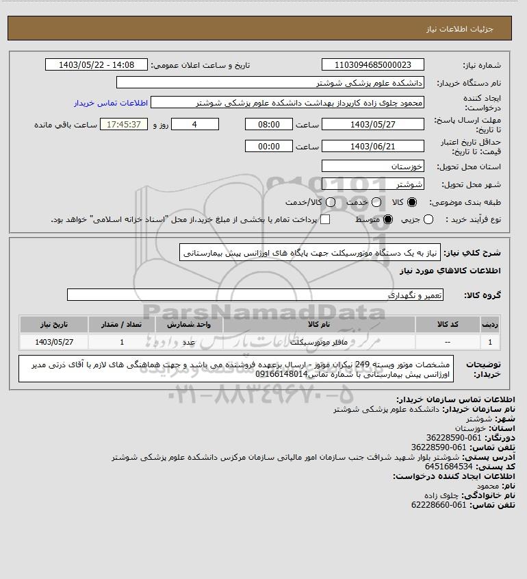 شرح کلی نیاز: نیاز به یک دستگاه موتورسیکلت جهت پایگاه های اورژانس پیش بیمارستانی
