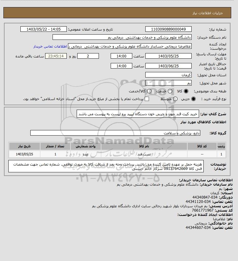 نام دستگاه خریدار:دانشگاه علوم پزشکی و خدمات بهداشتی درمانی بم