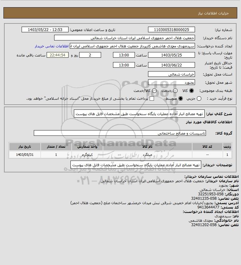 شرح کلی نیاز: تهیه مصالح انبار آماده عملیات پایگاه سنخواست طبق مشخصات فایل های پیوست