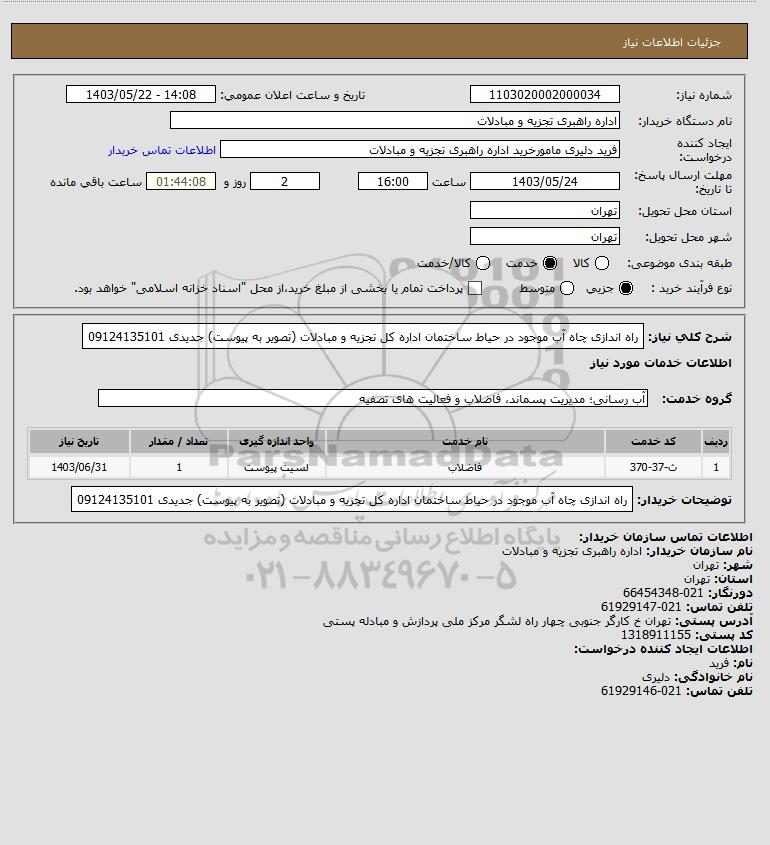 استعلام بها و موضوع استعلام استعلام راه اندازی چاه آب موجود در حیاط ساختمان اداره کل تجزیه و مبادلات (تصویر به پیوست) جدیدی 09124135101 به اطلاع کلیه شرکتها و افراد متخصص واجد شرایط میرساند، آگهی گذار در نظر دارد از طریق استعلام بها، نسبت به انتخاب و دریافت پیشنهادات اقدام نماید. این استعلام با کد آگهی ثبت شده در سامانه خبرگزاری پارس نماد : 7859669 منتشر شده است. مشخصات استعلام : تاریخ شروع استعلام: 1403/05/22 آخرین مهلت ارسال پیشنهاد قیمت : 1403/05/24 و محل اجرای پروژه : استان تهران میباشد. استعلام قیمت مورد درخواست : استعلام راه اندازی چاه آب موجود در حیاط ساختمان اداره کل تجزیه و مبادلات (تصویر به پیوست) جدیدی 09124135101 با دستهبندیهای تخصصی و گروه های مرتبط : پیمانکاری آب و فاضلاب, حفاری و حفر چاه آب, استعلام اطلاع رسانی میگردد.