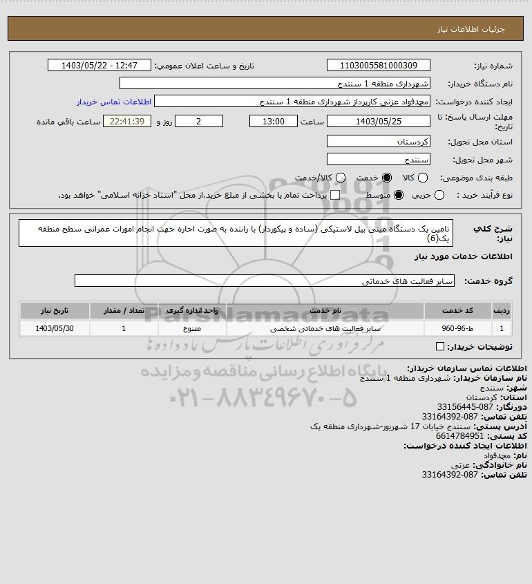 نام دستگاه خریدار:شهرداری منطقه 1 سنندج