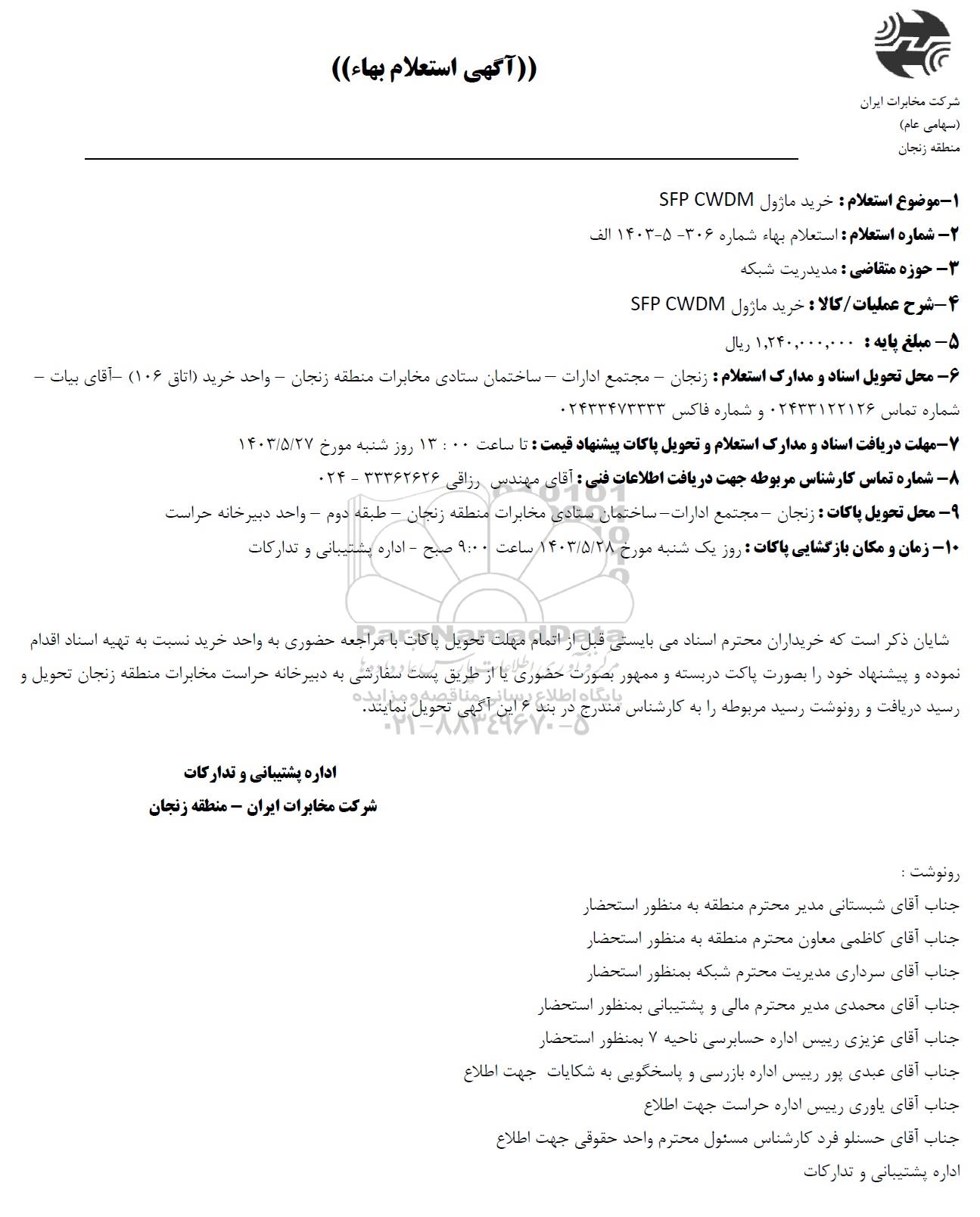 6)  محل تحویل اسناد و مدارک استعلام :  زنجان - مجتمع ادارات-  ساختمان ستادی مخابرات منطقه زنجان - واحد قراردادها (اتاق 106) اقای بیات مراجعه فرمایید - شماره تماس 02433122126- فاکس 02433473333