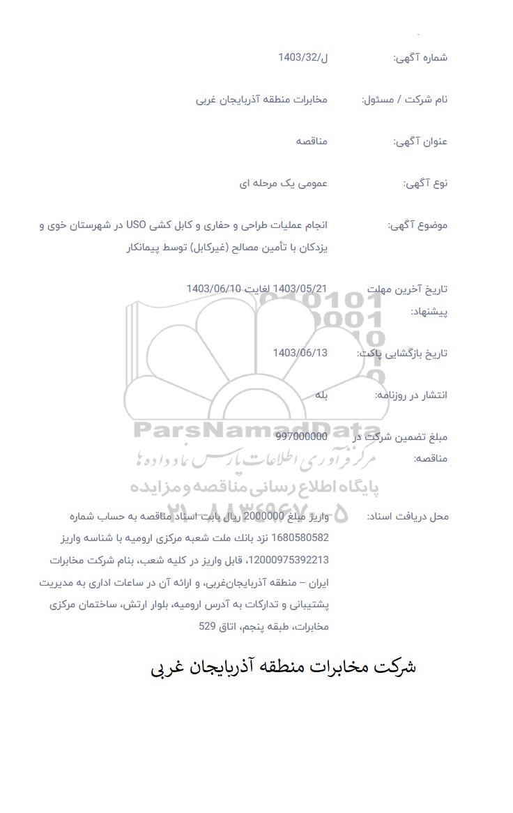 موضوع آگهی: انجام عملیات طراحی و حفاری و کابل کشی uso در شهرستان خوی و یزدکان با تامین مصالح (غیرکابل) توسط پیمانکار