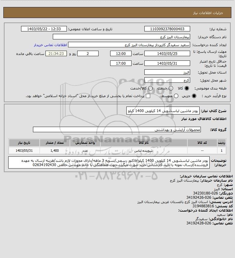 استعلام پودر ماشین لباسشویی 14 کیلویی 1400 کیلو, استعلام پودر ماشین لباسشویی 14 کیلویی 1400 کیلو