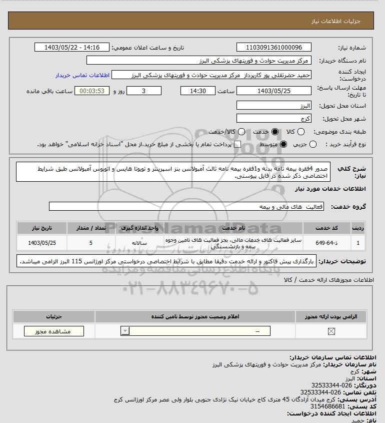نام سازمان خریدار: مرکز مدیریت حوادث و فوریتهای پزشکی البرز