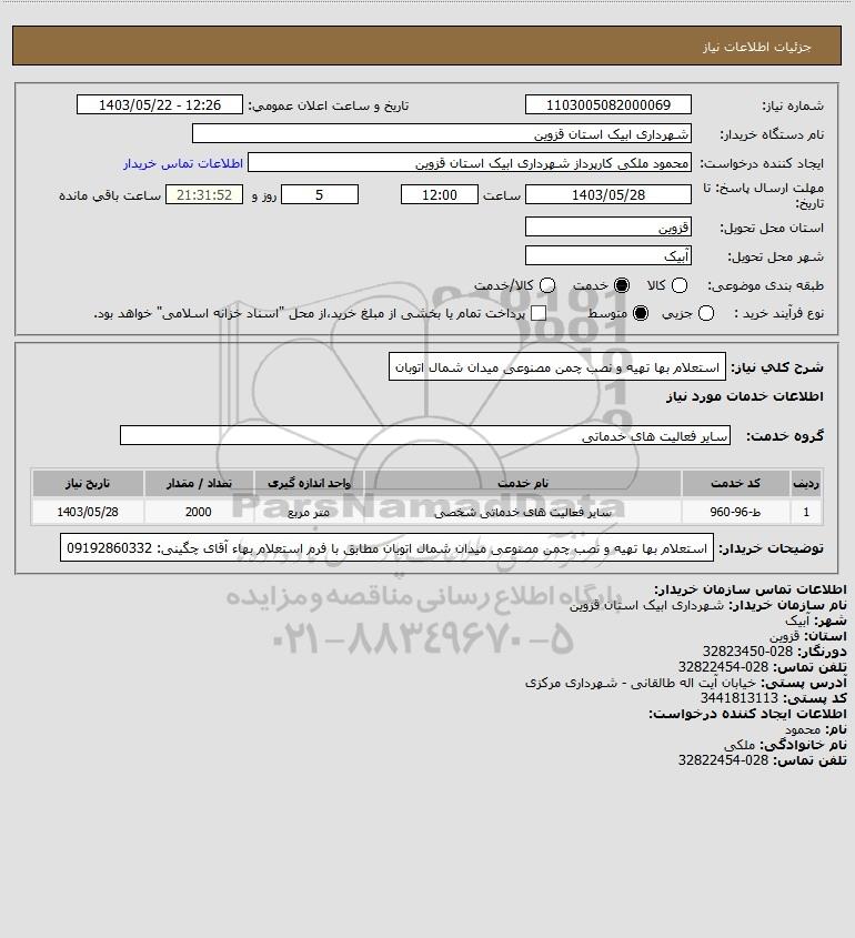 شرح کلی نیاز: استعلام بها تهیه و نصب چمن مصنوعی میدان شمال اتوبان