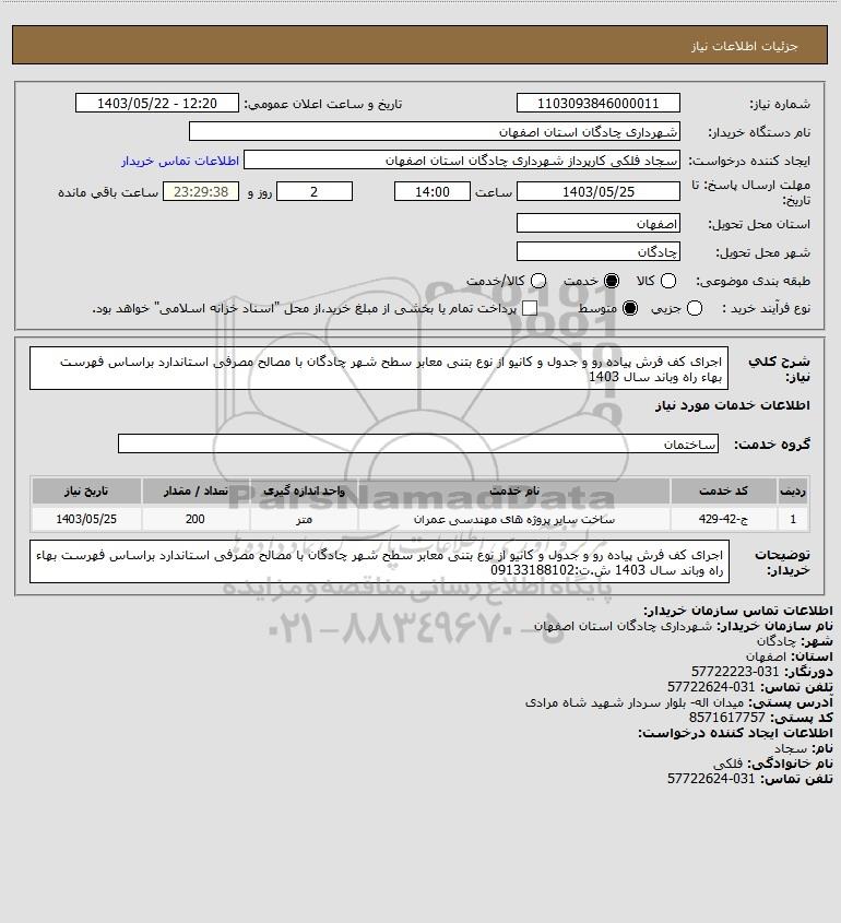 شرح کلی نیاز: اجرای کف فرش پیاده رو و جدول و کانیو از نوع بتنی معابر سطح شهر چادگان با مصالح مصرفی استاندارد براساس فهرست بهاء راه وباند سال 1403