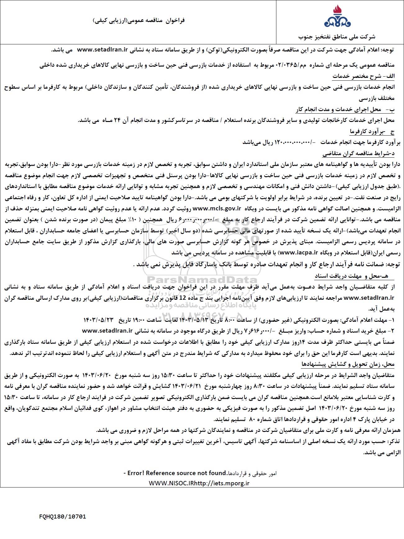 مناقصه عمومی یک مرحله ای شماره م م / 02/0365 مربوط به استفاده از خدمات بازرسی فنی حین ساخت و بازرسی نهایی کالاهای خریداری شده داخلی
