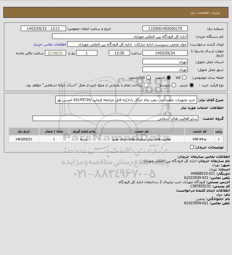 استعلام خرید تجهیزات جهت نصب پمپ چاه جنگل رادار/به فایل مراجعه فرمایید/63145724 حسین پور, استعلام خرید تجهیزات جهت نصب پمپ چاه جنگل رادار/به فایل مراجعه فرمایید/63145724 حسین پور