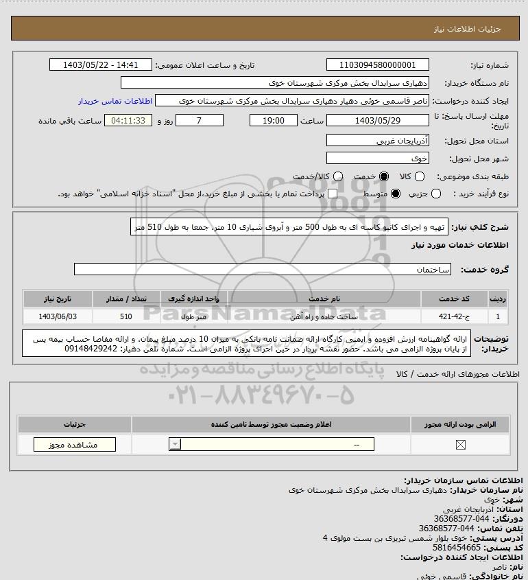 شرح کلی نیاز: تهیه و اجرای کانیو کاسه ای به طول 500 متر و آبروی شیاری 10 متر. جمعا به طول 510 متر
