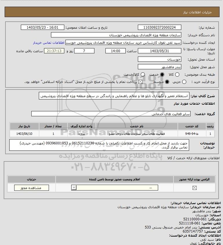 شرح کلی نیاز: استعلام تعمیر و نگهداری تابلو ها و علائم راهنمایی و رانندگی در سطح منطقه ویژه اقتصادی پتروشیمی