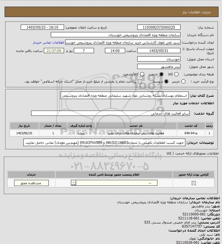 استعلام استعلام بهسازی شبکه روشنایی بلوار شهید سلیمانی منطقه ویژه اقتصادی پتروشیمی, استعلام استعلام بهسازی شبکه روشنایی بلوار شهید سلیمانی منطقه ویژه اقتصادی پتروشیمی