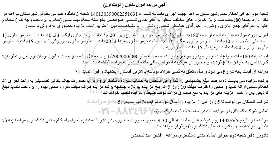 شعبه دوم اجرای احکام مدنی شهرستان مراغه جهت اجرای دادنامه شماره 140130390002351631 شعبه 3 دادگاه عمومی حقوقی شهرستان مراغه در نظر دارد جمعا 180جفت لنت ترمز خودرو های مختلف متعلق به آقای هادی شمسی صوفحسن بخواسته محکومیت مدنی (حکم به پرداخت وجه نقد ) محکوم علیه به نام آقای جعفر باقری روشی در حق آقای عباسقلی شفائی روشتی را با مشخصات ذیل ازطریق انجام مزایده حضوری به فروش برساند: