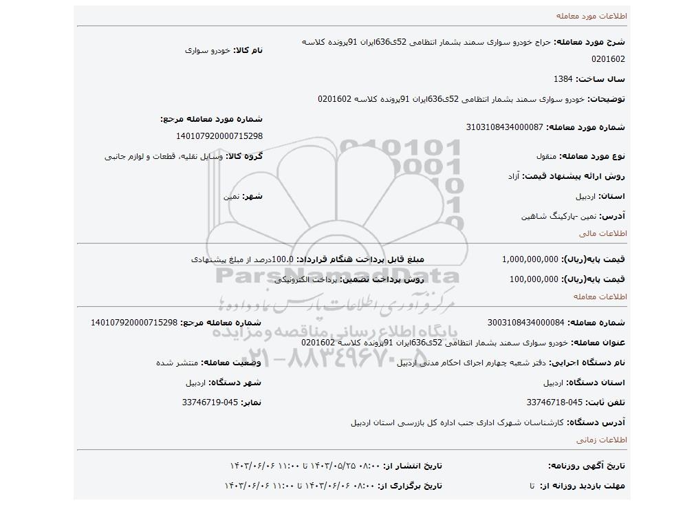 مزایده، خودرو سواری سمند بشمار انتظامی 52ی636ایران 91پرونده کلاسه 0201602