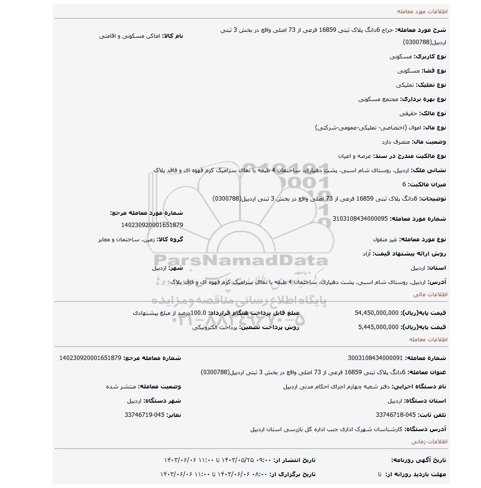 مزایده 6دانگ پلاک ثبتی 16859 فرعی از 73 اصلی واقع در بخش 3 ثبتی اردبیل(0300788), مزایده، 6دانگ پلاک ثبتی 16859 فرعی از 73 اصلی واقع در بخش 3 ثبتی اردبیل(0300788)