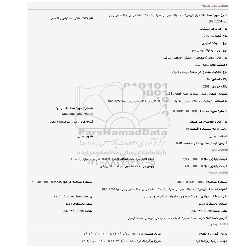 شرح مورد معامله: حراج فروش2سهماز9سهم عرصه واعیان پلاک 6261فرعی از34اصلی زمین بایر(0201254) | نام کالا: اماکن مسکونی و اقامتی | |