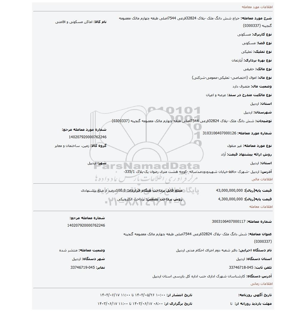 مزایده شش دانگ ملک -پلاک 32824فرعی 7544اصلی طبقه چهارم مالک معصومه گنجینه (0300337), مزایده، شش دانگ ملک -پلاک 32824فرعی 7544اصلی طبقه چهارم مالک معصومه گنجینه (0300337)